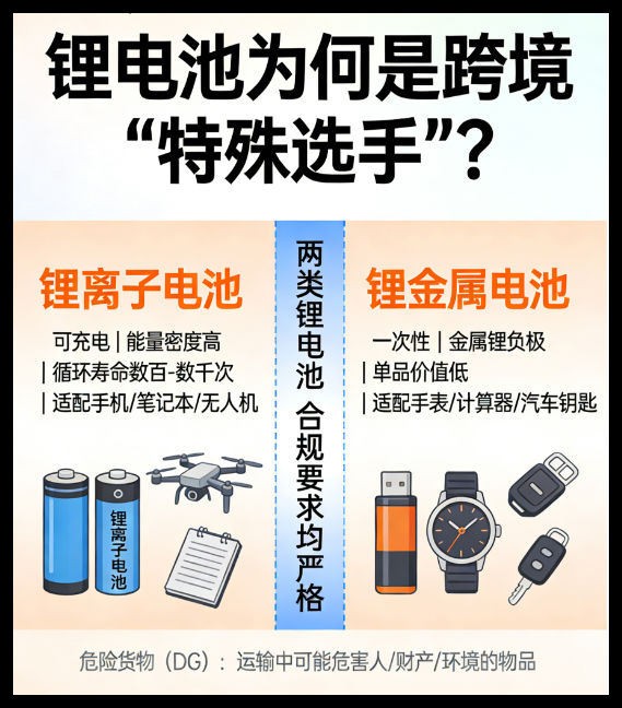 锂金属电池:一次性使用,以金属锂为负极,常用于手表、计算器、汽车钥匙等小件商品,虽单品价值不高,但合规要求同样严格。