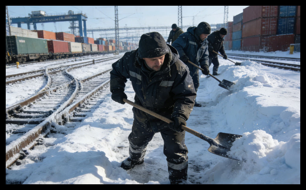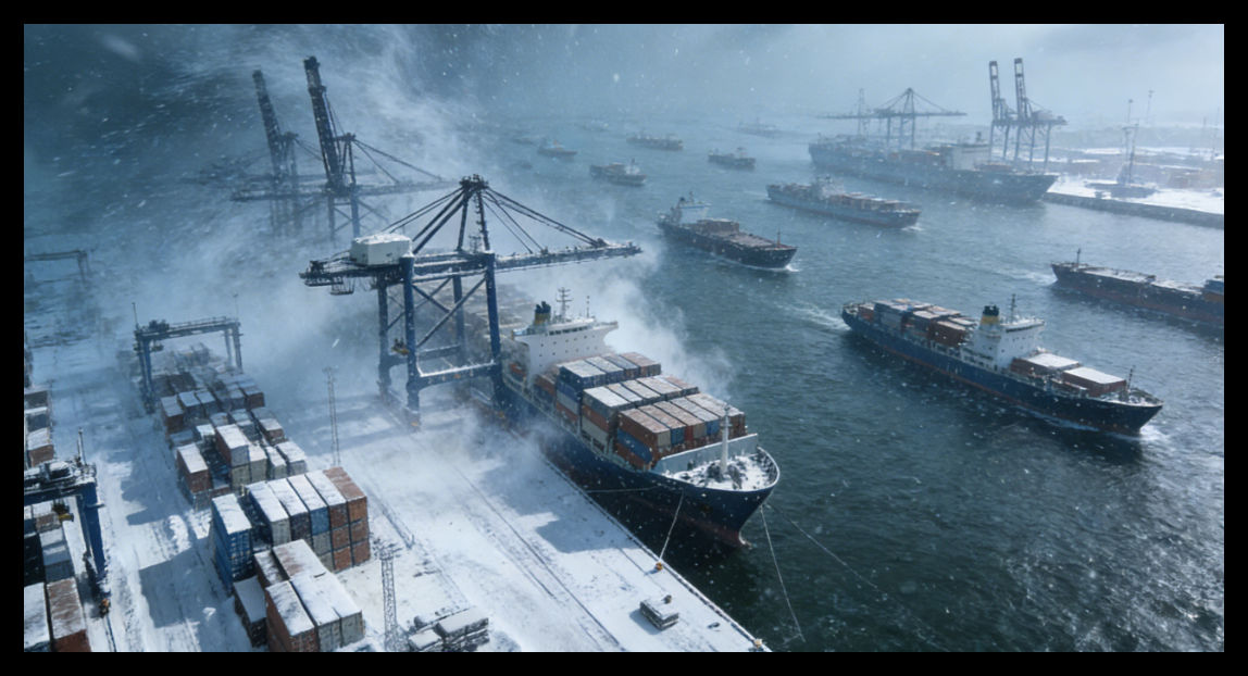 水侧作业:效率骤降:暴雪叠加设备冻结,单小时集装箱装卸效率大幅下滑,船舶靠泊、货物卸载进度严重滞后。